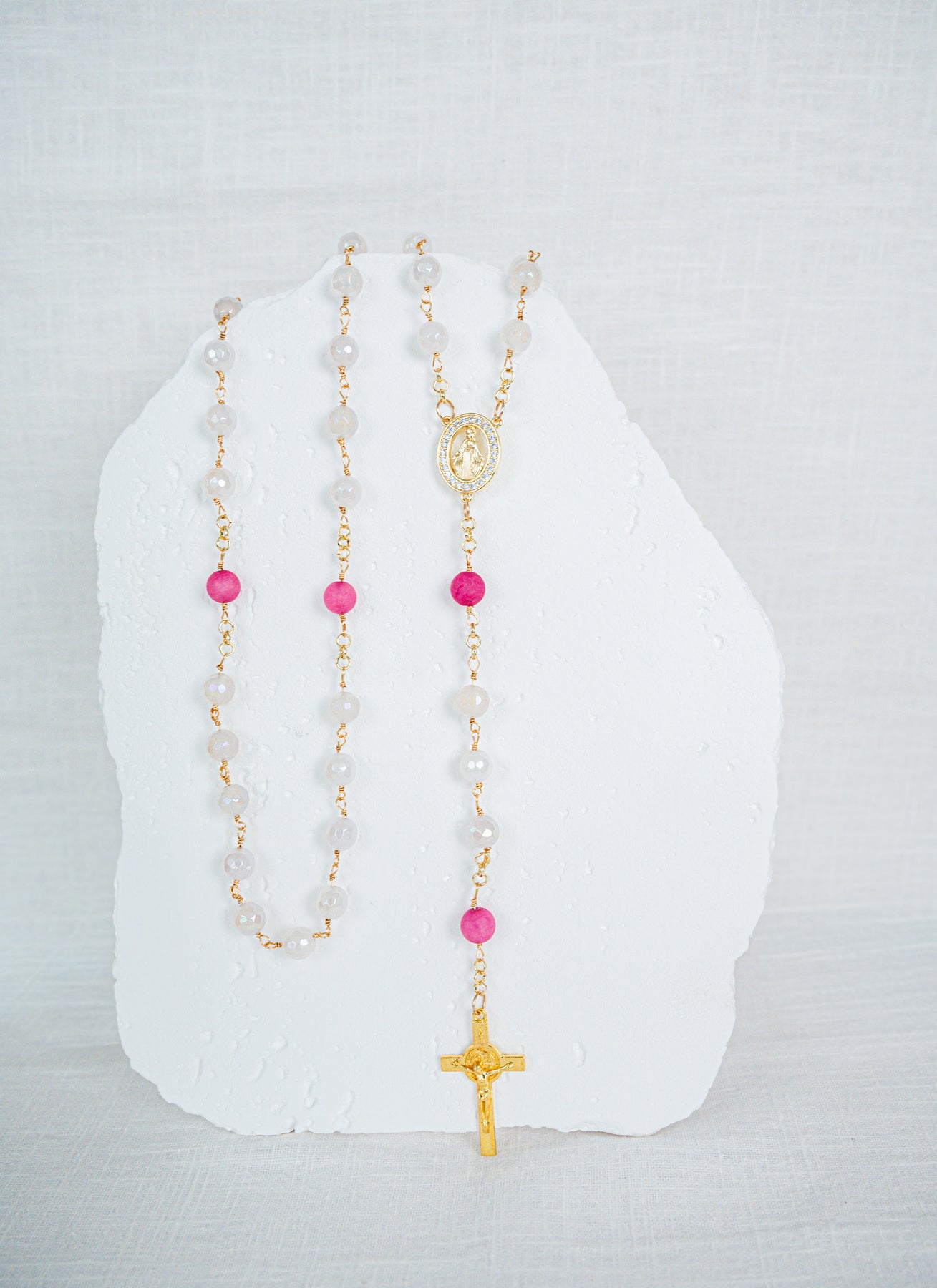 Radiant in pink and rose gemstone hues, the Divine Joy Rosary celebrates the tender joy found in prayer and the love of Our Lady. Each bead reflects a heart lifted in thanksgiving, a reminder that joy is the most beautiful form of faith.