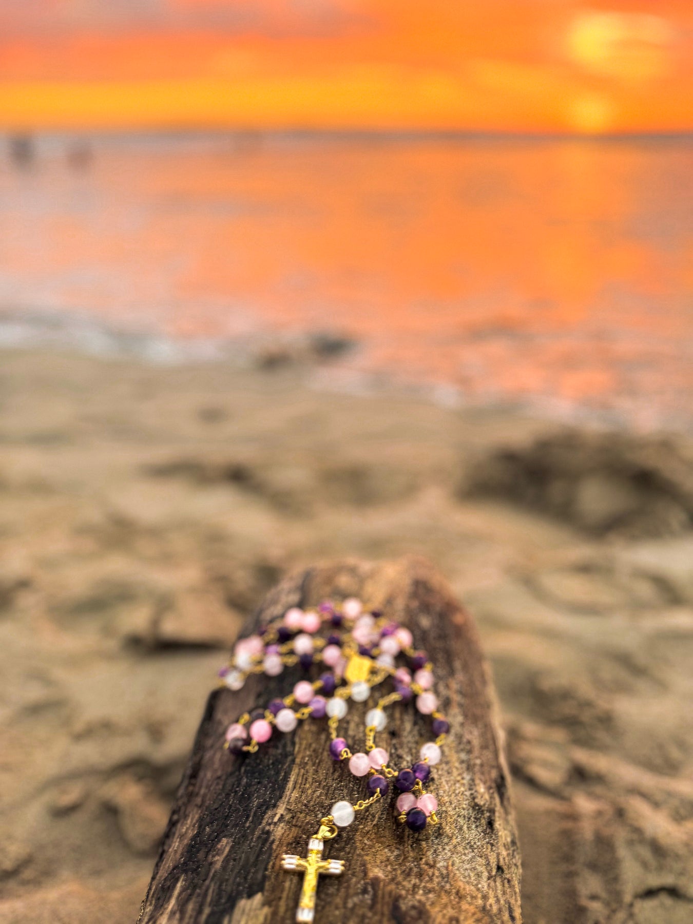Rose beads mark the joyful shift of Gaudete Sunday—a moment of uplift during the waiting.